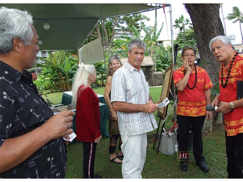 Perplexed at the festival information booth with Glen Keliikoa, Patricia Kuwaye, Louise Lambert, Joel Katz, Alan Akaka, and Addison Ching