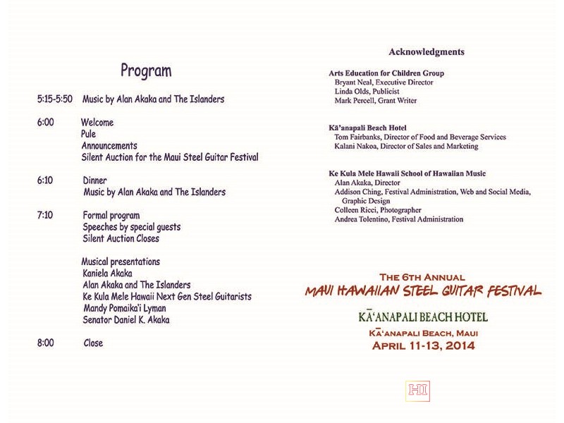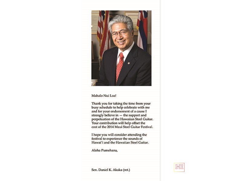 The purpose of Maui Mahalo fundraiser is to recognize and honor someone in the community who has made a difference. Proceeds of the fundraiser go directly towards the support of the Maui Steel Guitar Festival. This year's honoree was Senator Daniel K. Akaka (ret.)