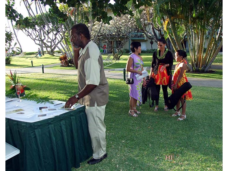 Bryant Neal at registration desk with Kathy Collins, Pomaika'i Lyman and Mālie Lyman in background.