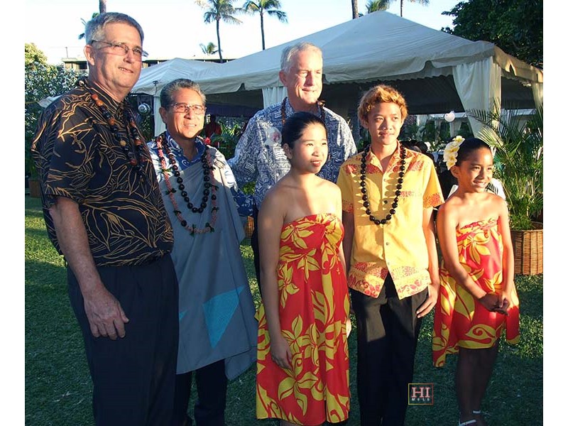 Front: Ke Kula Mele Hawaii Next Gen players Alexis, Keen and Mālie. Rear: Tom Fairbanks, Danny ''Kaniela'' Akaka Jr., Kā'anapali Beach Hotel General Manager Mike White.