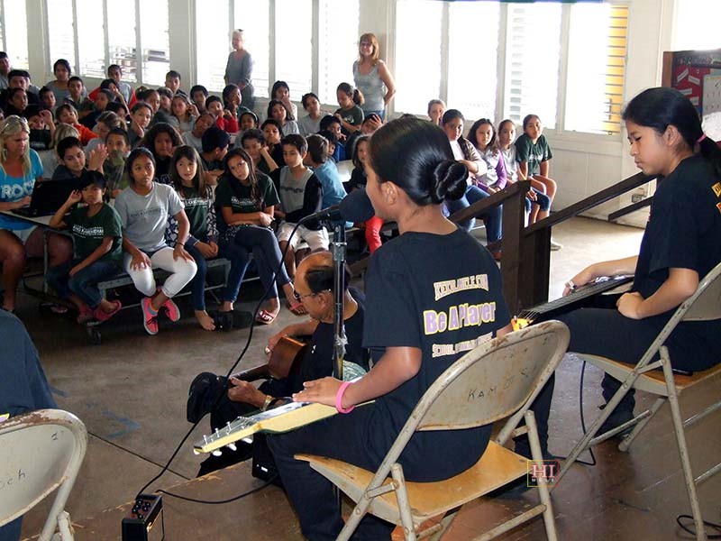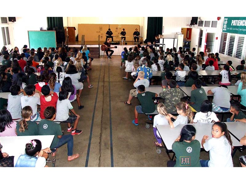 King Kamehameha III Elementary School was one of the schools visited by festival presentation teams to introduce the steel guitar to school students, demonstrate its role in Hawaiian music, and provide hands-on opportunities for school students to try out the instrument.
