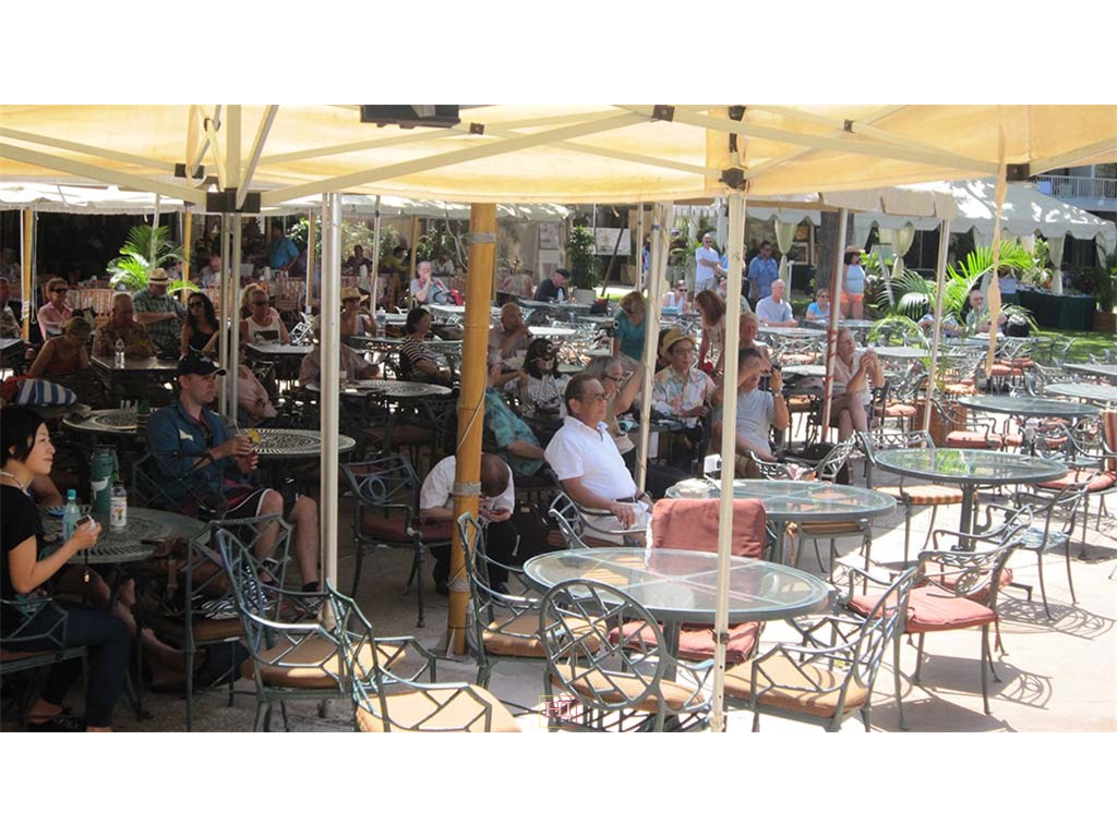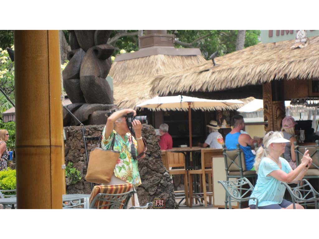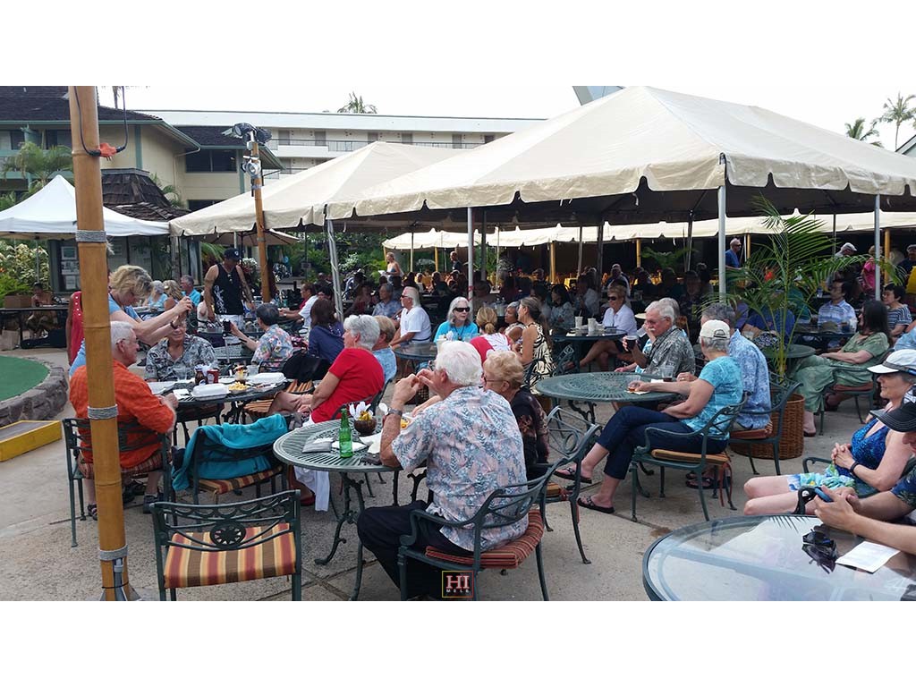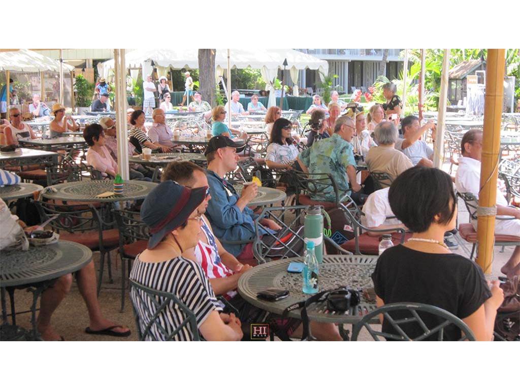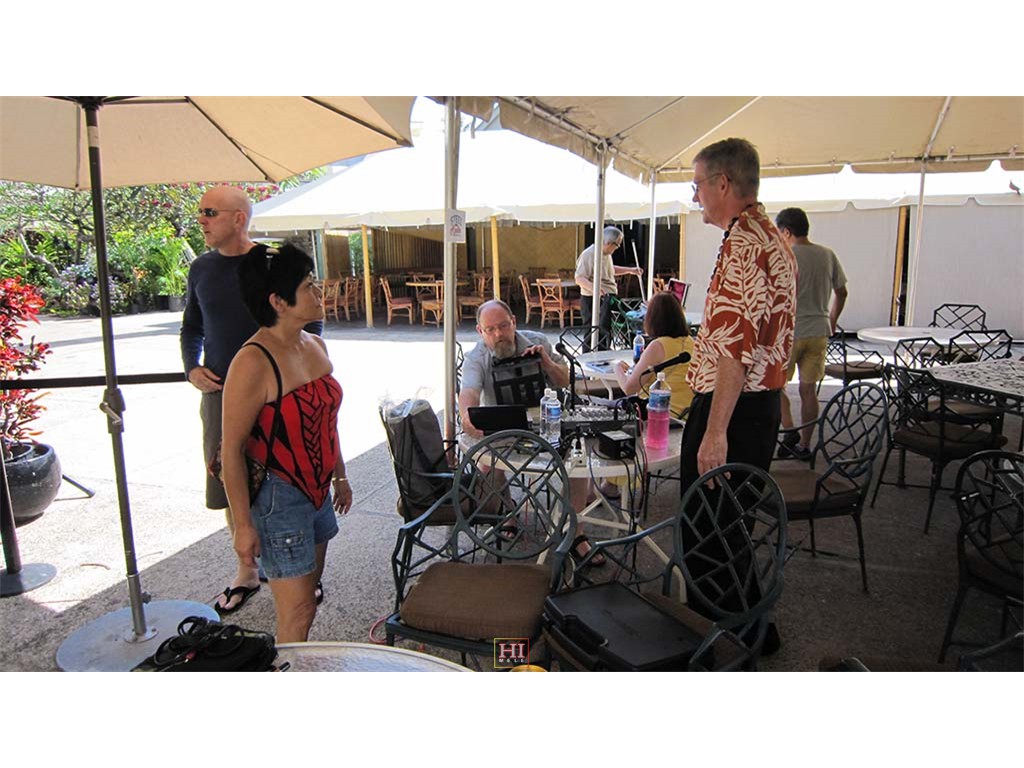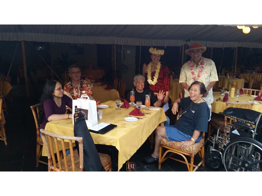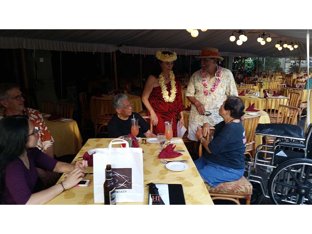 Hotel restaurant guests include hotel Food and Beverage Director Tom Fairbanks, Senator Daniel Akaka, hula dancer Maile Keawe Bryan, and Mrs. Akaka.