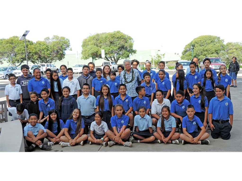 Senator Akaka with Kamehameha School students. Photo by Pomaika'i Lyman.
