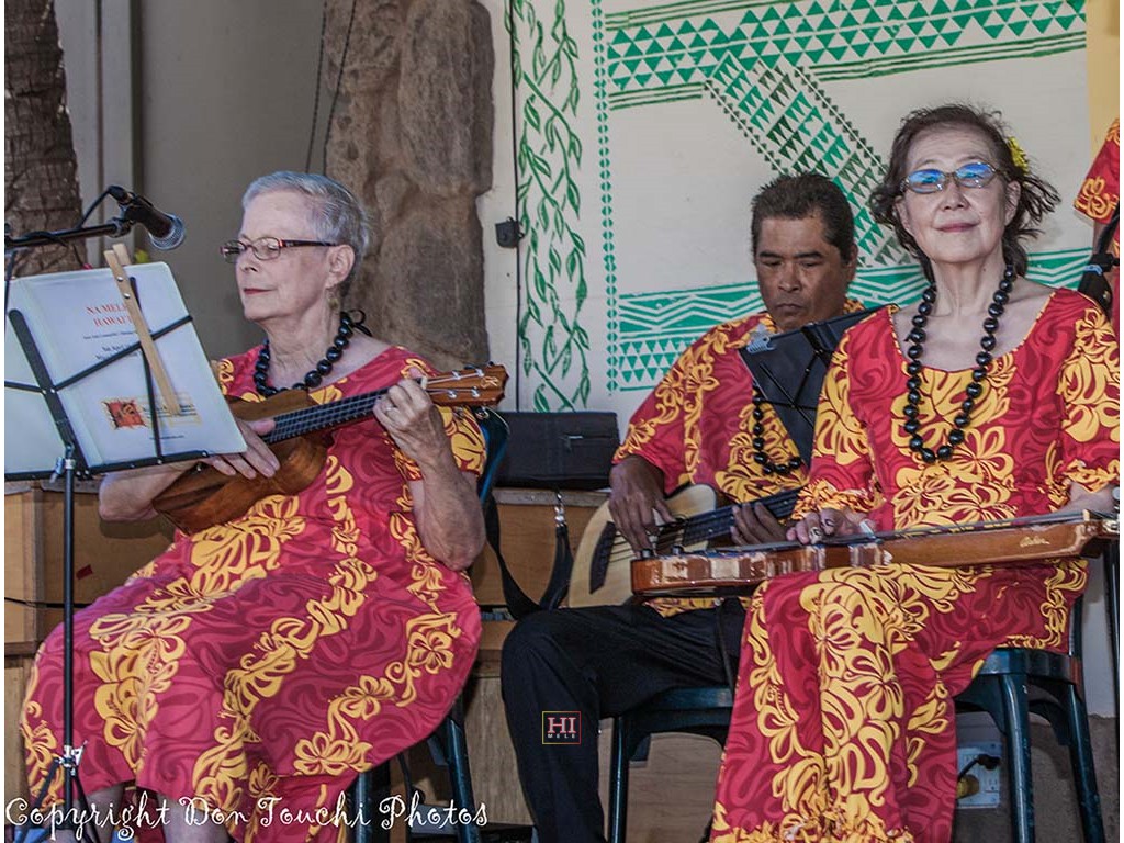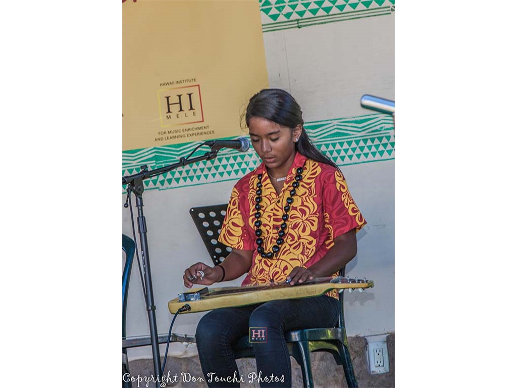 Students from Ke Kula Mele Hawaii School of Hawaiian Music performed on Saturday's open stage. The group was led by steel guitarist Alan Akaka (who also performed in Friday's Ho'olaule'a program). Many of the ensemble performers are also steel guitar students of the school.