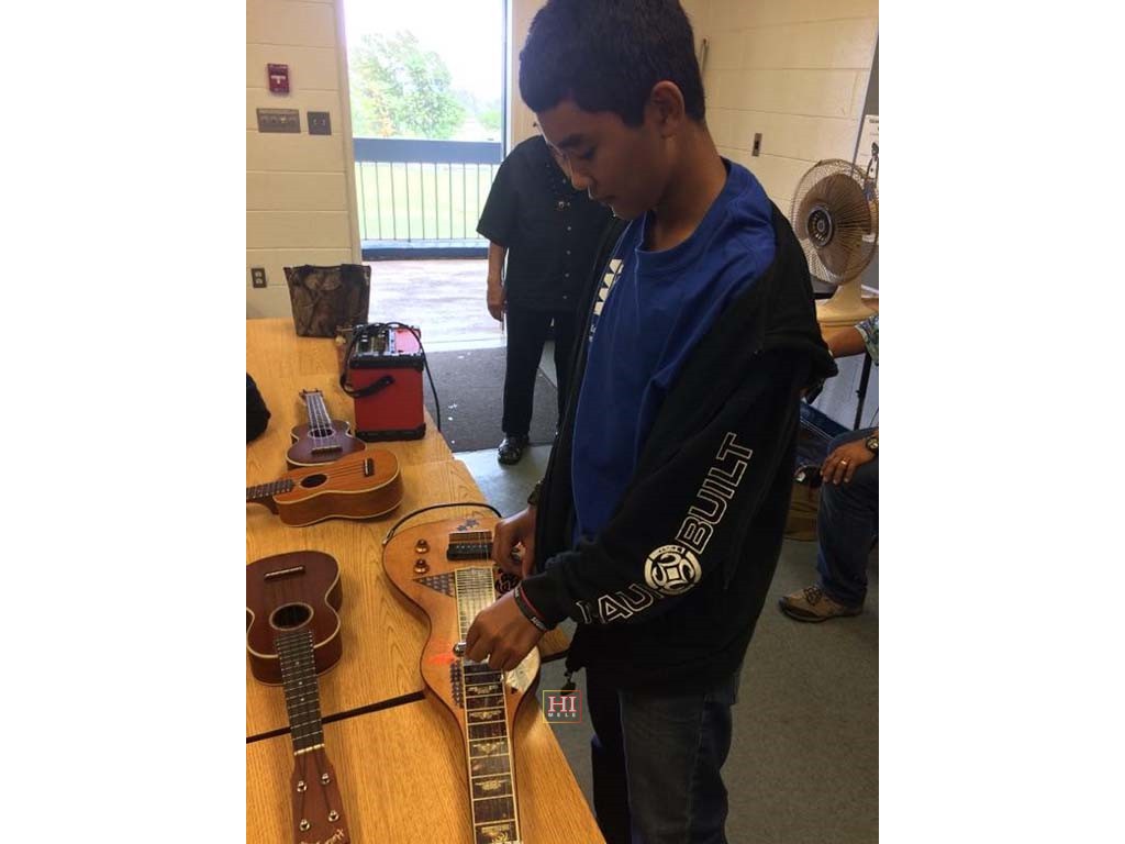A student trying her hand at playing the steel guitar. Photo by Sandy Sardinha.