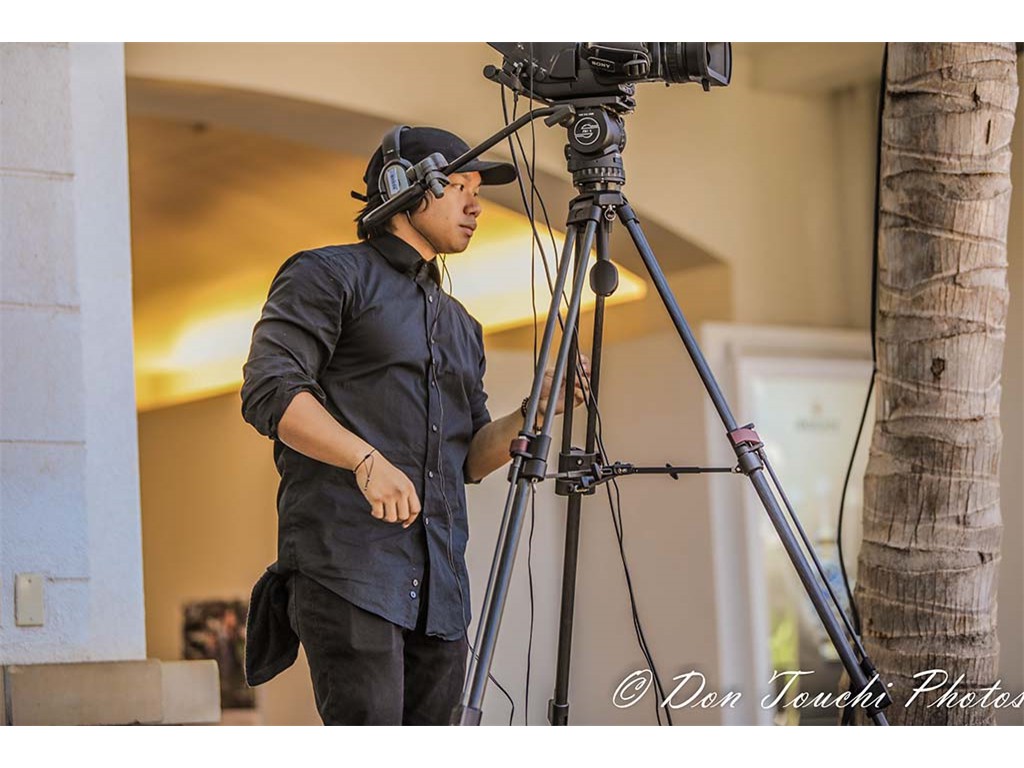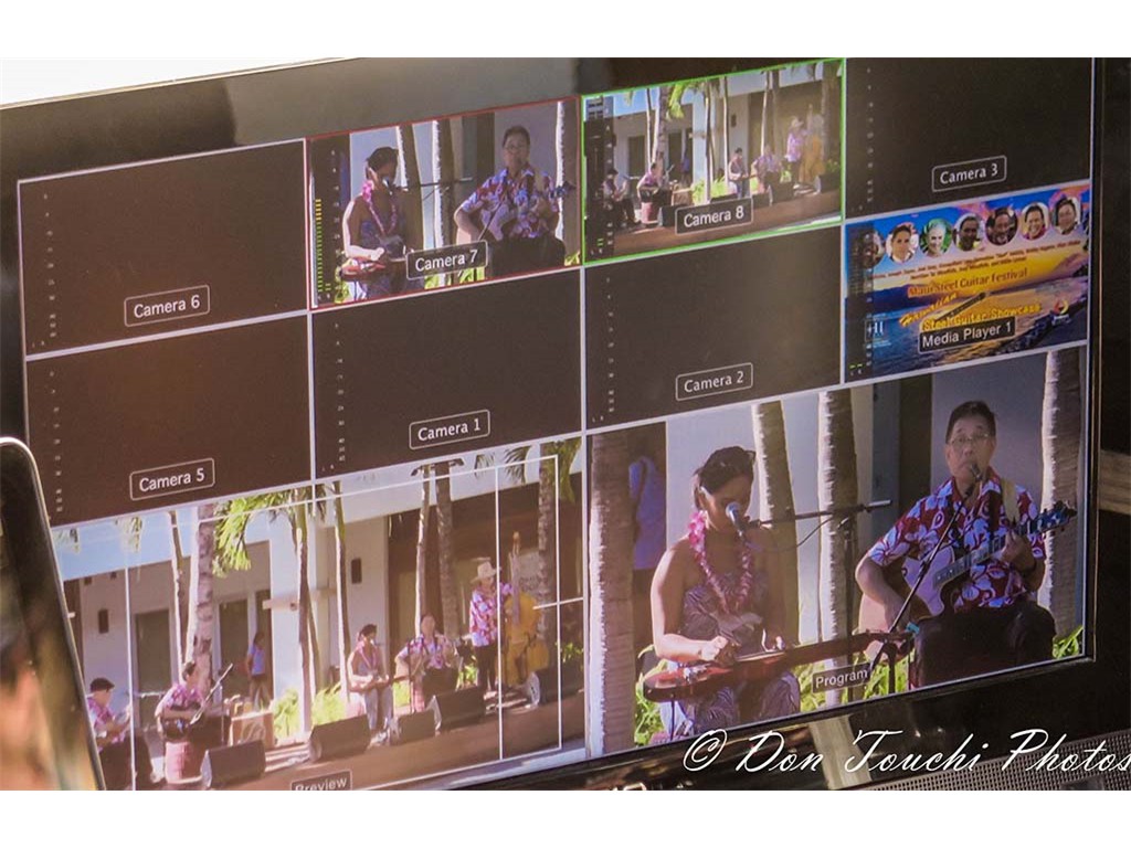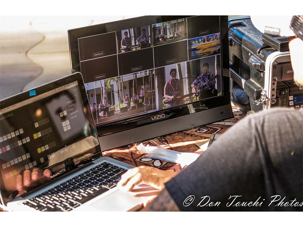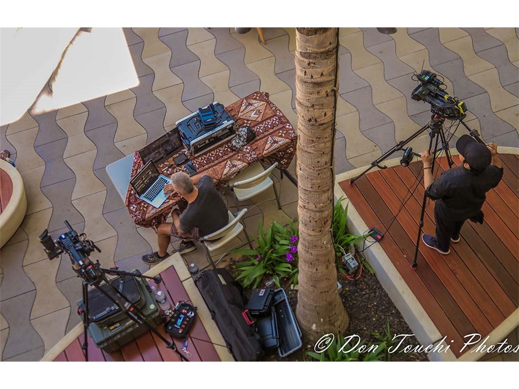 Birdʻs-eye view of the livestream operation with Daniel Emhoff and Austin Alimbuyuguen.