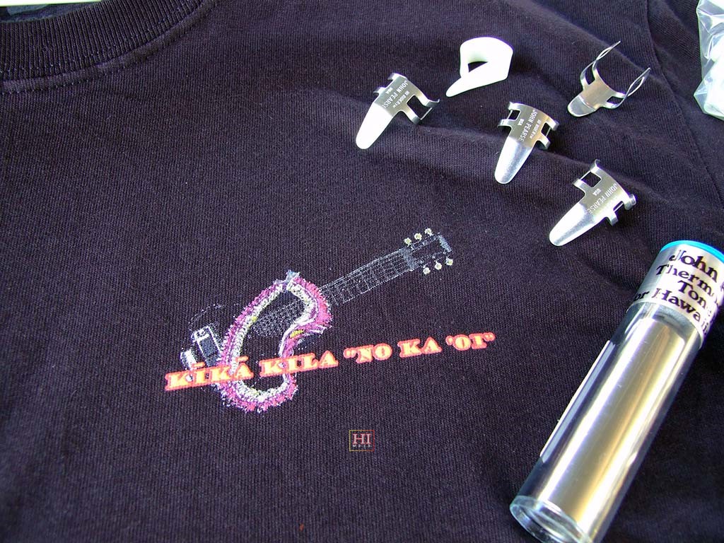Steel guitar players' tools of the trade on a festival t-shirt.