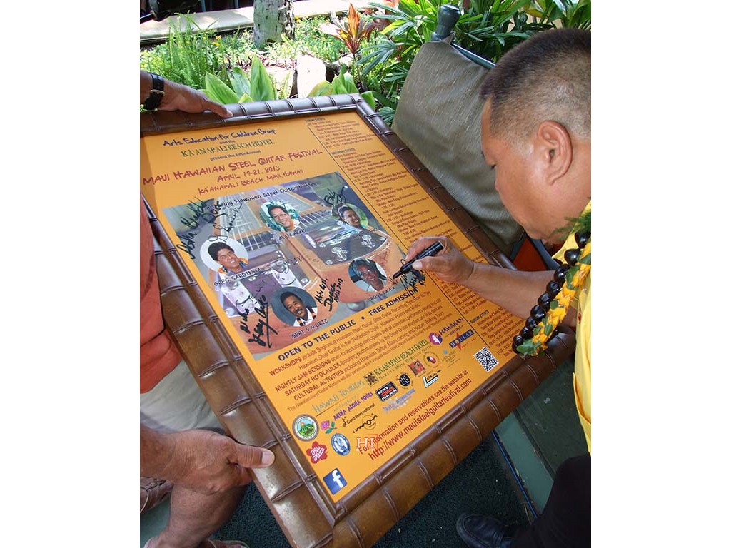 Kaipo Asing autographing the AECG archives Festival poster.