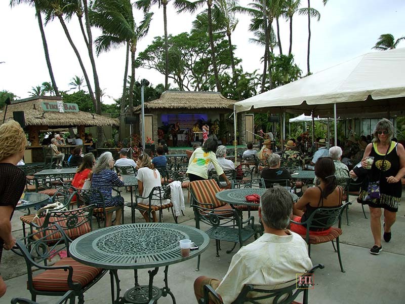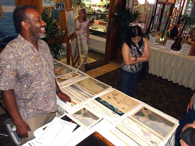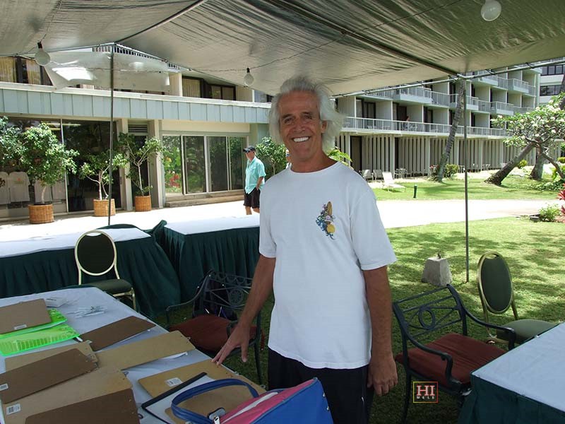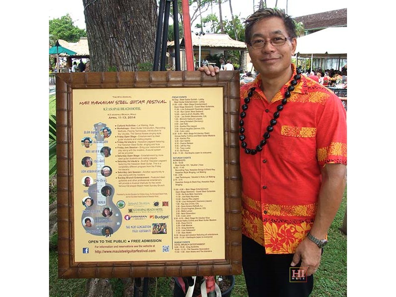 Alan Akaka with hotel lobby festival poster.