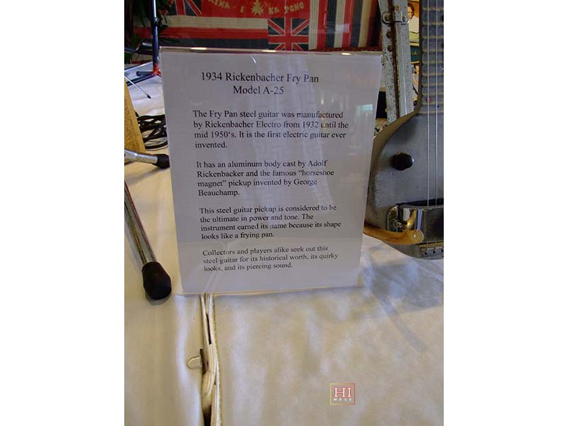Information sheet for a 1934 Rickenbacher Frypan Model A-25 (partially visible.)