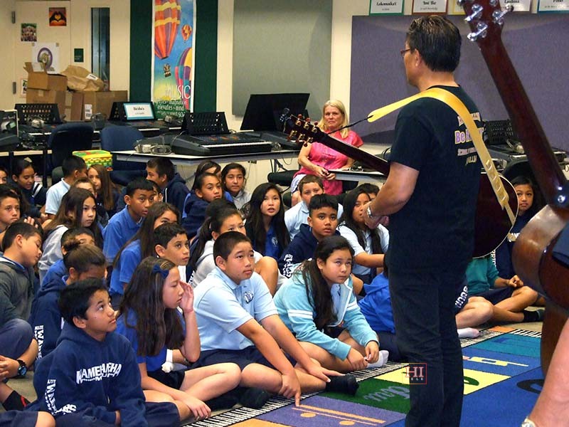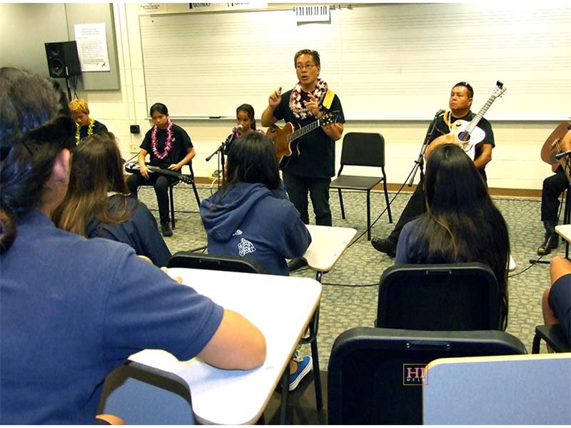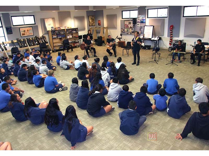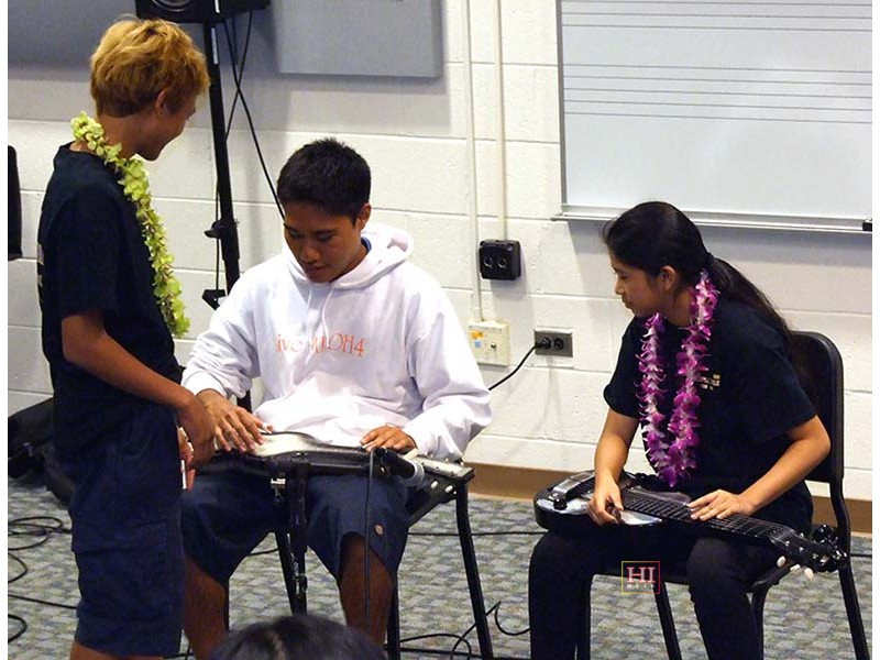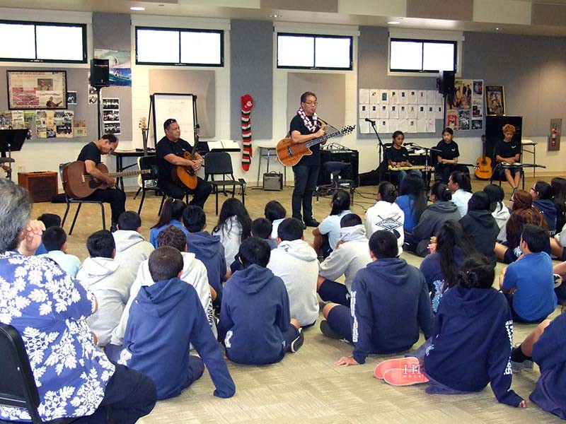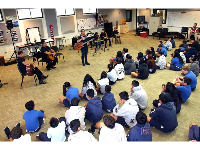 Kamehameha School was one of the schools visited by festival presentation teams to introduce the steel guitar to school students, demonstrate its role in Hawaiian music, and provide hands-on opportunities for school students at elementary, middle, and high school levels, to try out the instrument.