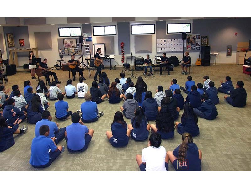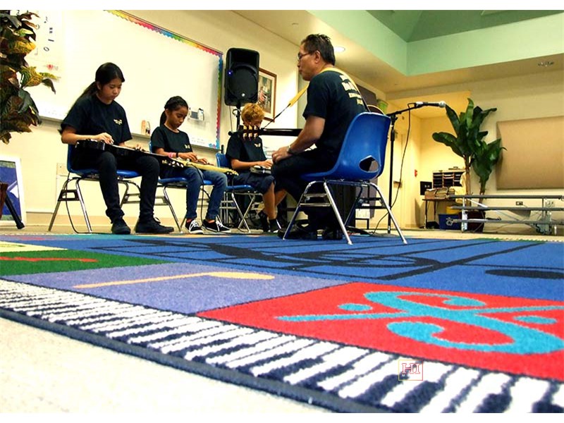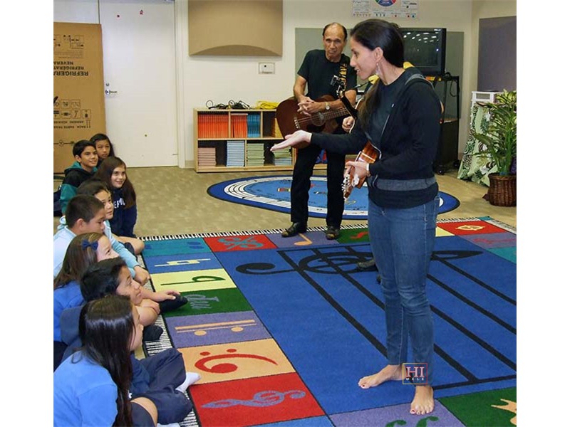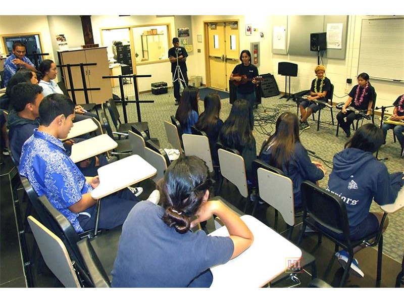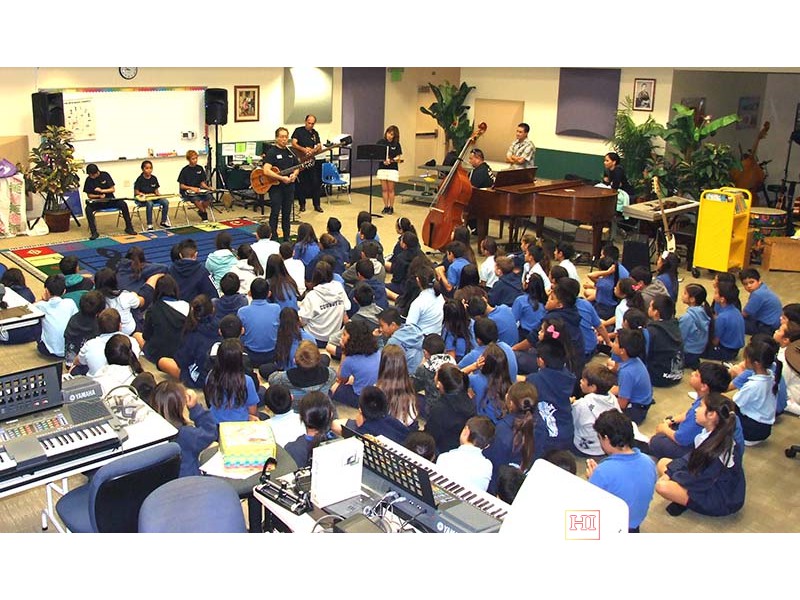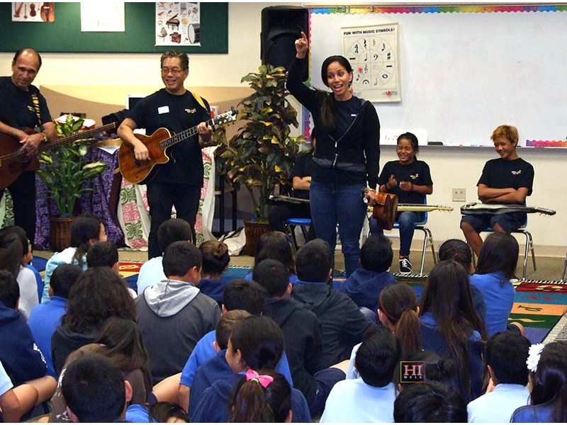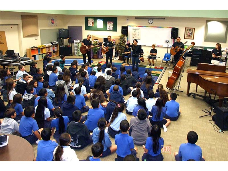 Kamehameha School was one of the schools visited by festival presentation teams to introduce the steel guitar to school students, demonstrate its role in Hawaiian music, and provide hands-on opportunities for school students at elementary, middle, and high school levels, to try out the instrument.