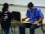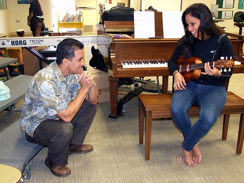 Mālie Lyman shares her steel guitar with a high school student.