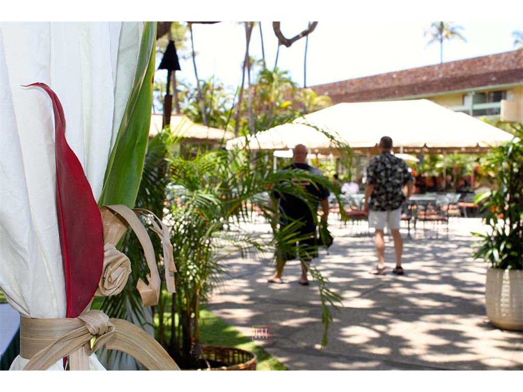 Drapery ties by the hotel's cultural specialist Malihini decorated the information tent. Photo by Jenny Greene, Ka'anapali Beach Hotel.