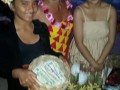 Mālie shows off some of the ''pass the hat'' contributions to Alexis with Kathy Collins. The collection was conducted to help defray festival costs. Photo by Pomaika'i Lyman.