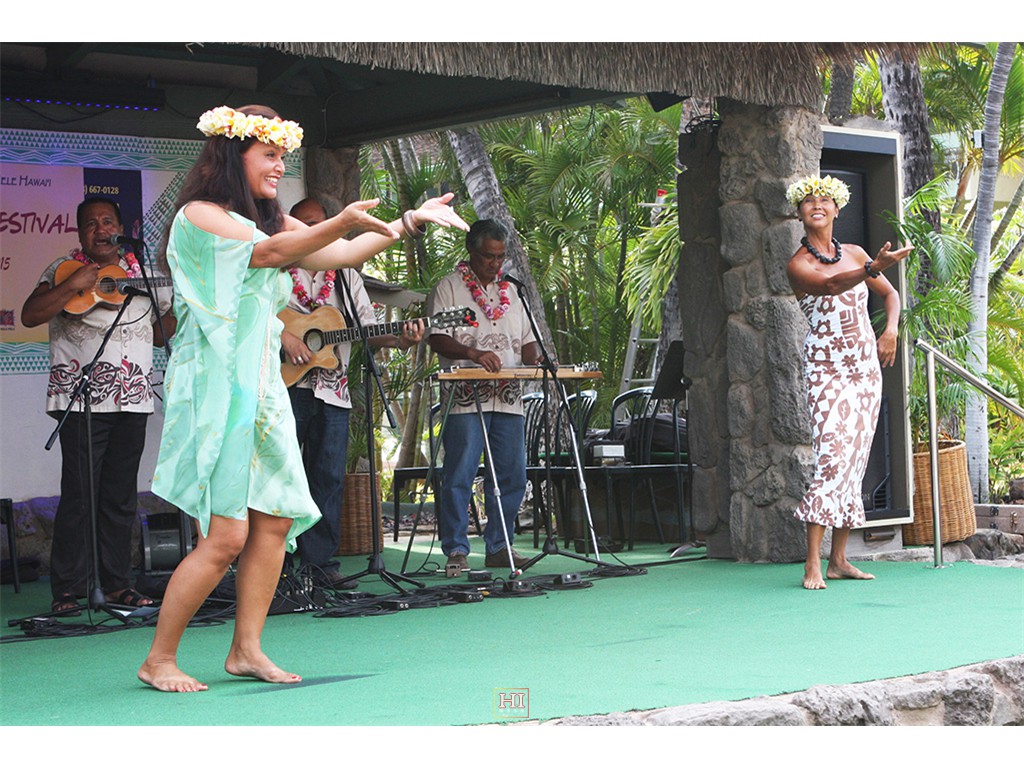 Kawika Ho'opi'i, Brandon Hirata, and Ross Ka'a'a with dancers Maile Keawe and Wainani Kealoha.