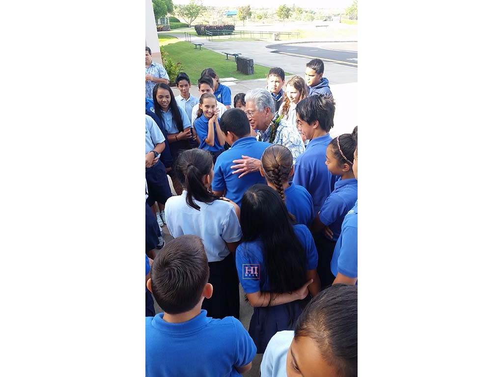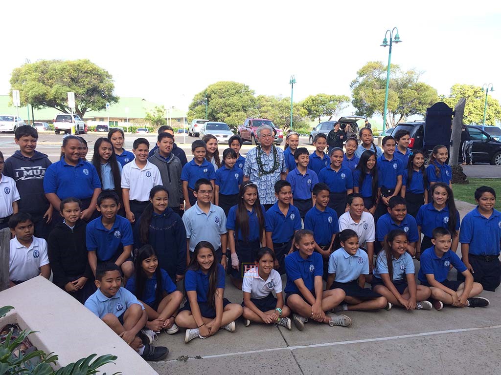 • Senator Akaka with Kamehameha School students. Photo by Pomaika'i Lyman.