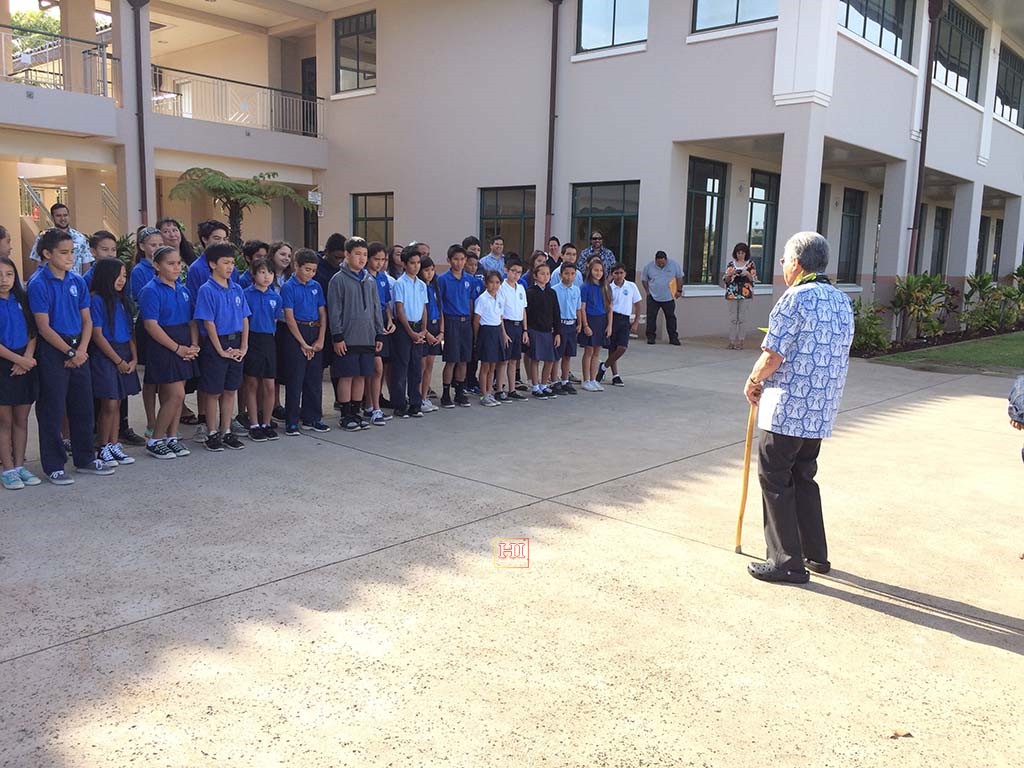• The Kamehameha School assembly with Senator Akaka. Photo by Andrea Tolentino.