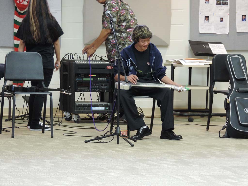 • Next gen steel guitarist Keen Ching getting ready for his performance at Kamehameha Middle School. Photo by Dr. Thomas Ching.