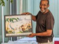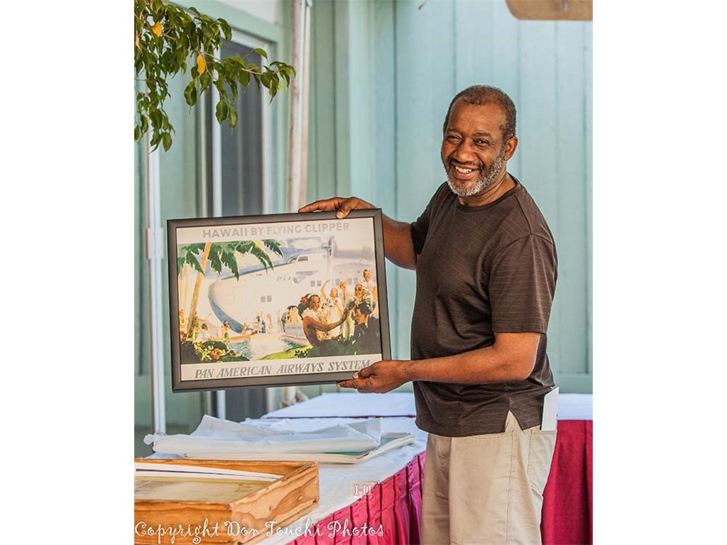 Bryant Neal of AECG displays a framed poster from his graphics collection