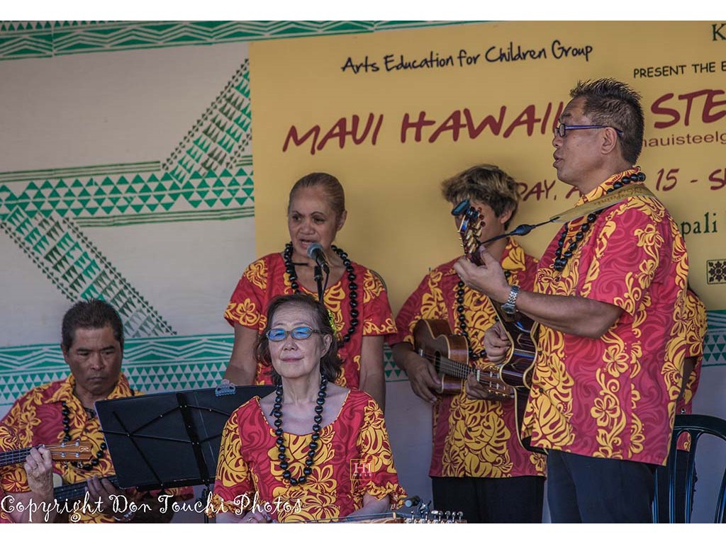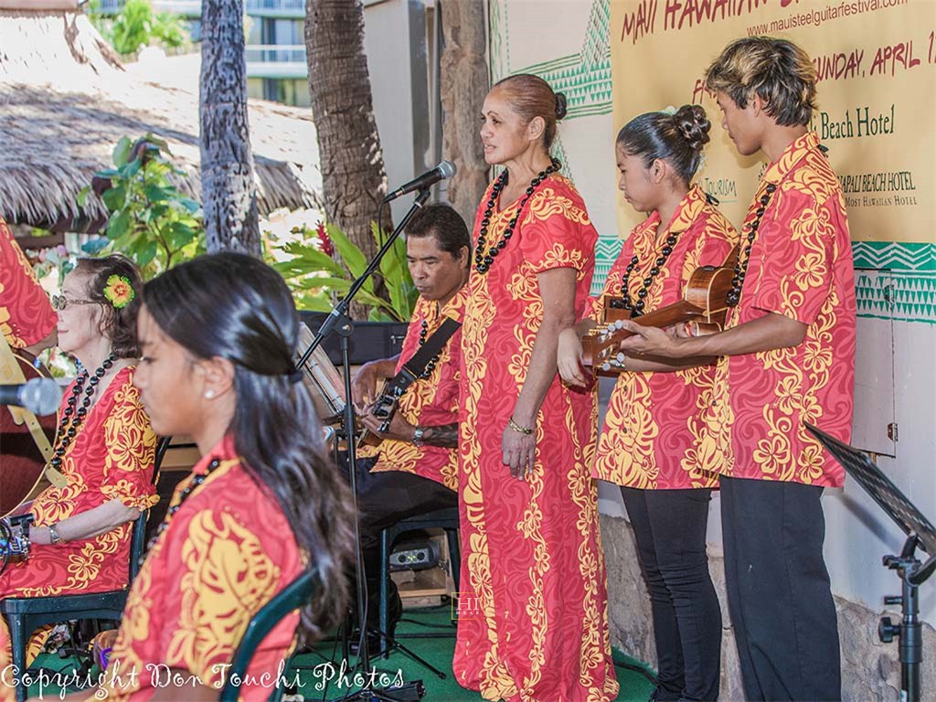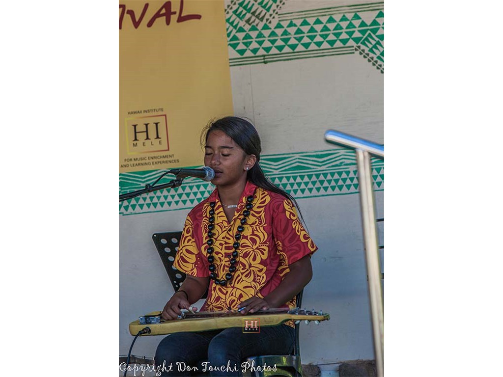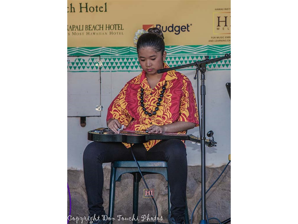 Students from Ke Kula Mele Hawaii School of Hawaiian Music performed on Saturday's open stage. The group was led by steel guitarist Alan Akaka (who also performed in Friday's Ho'olaule'a program). Many of the ensemble performers are also steel guitar students of the school.