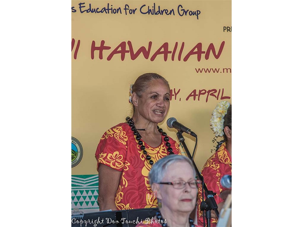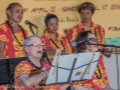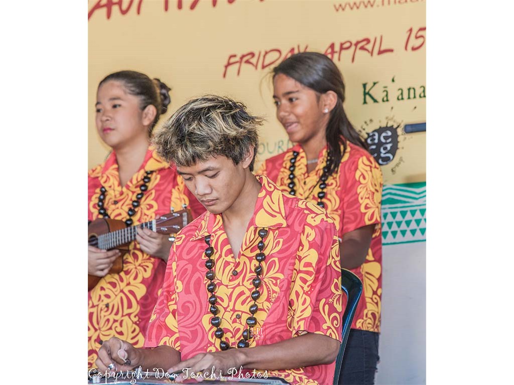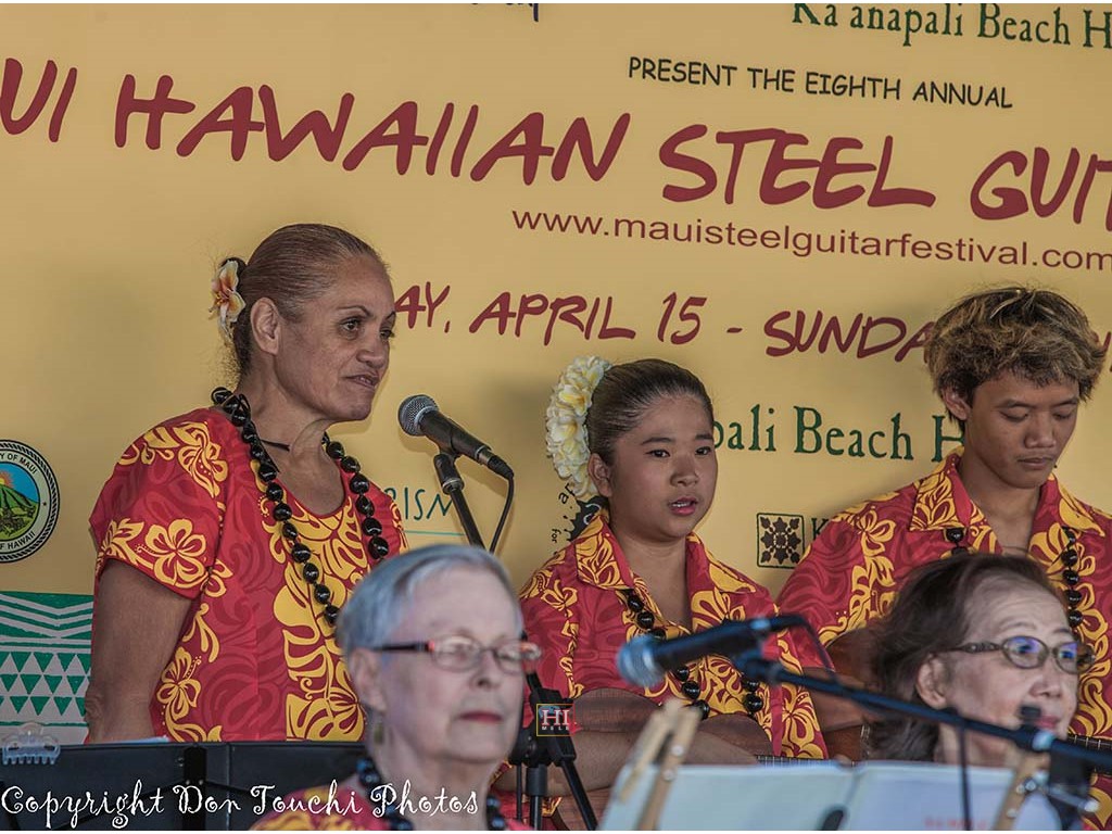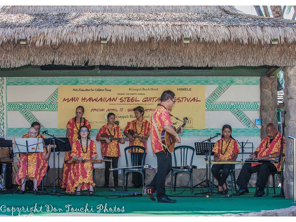 Students from Ke Kula Mele Hawaii School of Hawaiian Music performed on Saturday's open stage. The group was led by steel guitarist Alan Akaka (who also performed in Friday's Ho'olaule'a program). Many of the ensemble performers are also steel guitar students of the school.
