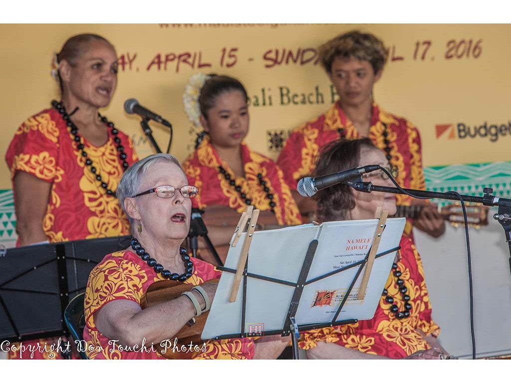Students from the Ke Kula Mele Hawaii School of Hawaiian Music performed on the open stage. From left: Gale Warshawsky, Ronald Tolentino, Shirley Holu, Noriko Tomita, Alexis Tolentino, Keen, Ching, school director Alan Akaka, Mālie Lyman, and Larry Holu.