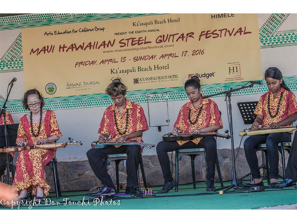 Steel guitar students in a group performance of the Mauna Kea/Mauna Loa medley. From left: Noriko Tomita, Keen Ching, Alexis Tolentino, and Mālie Lyman.Back to Gallery: 2016 Festival