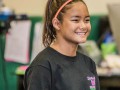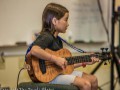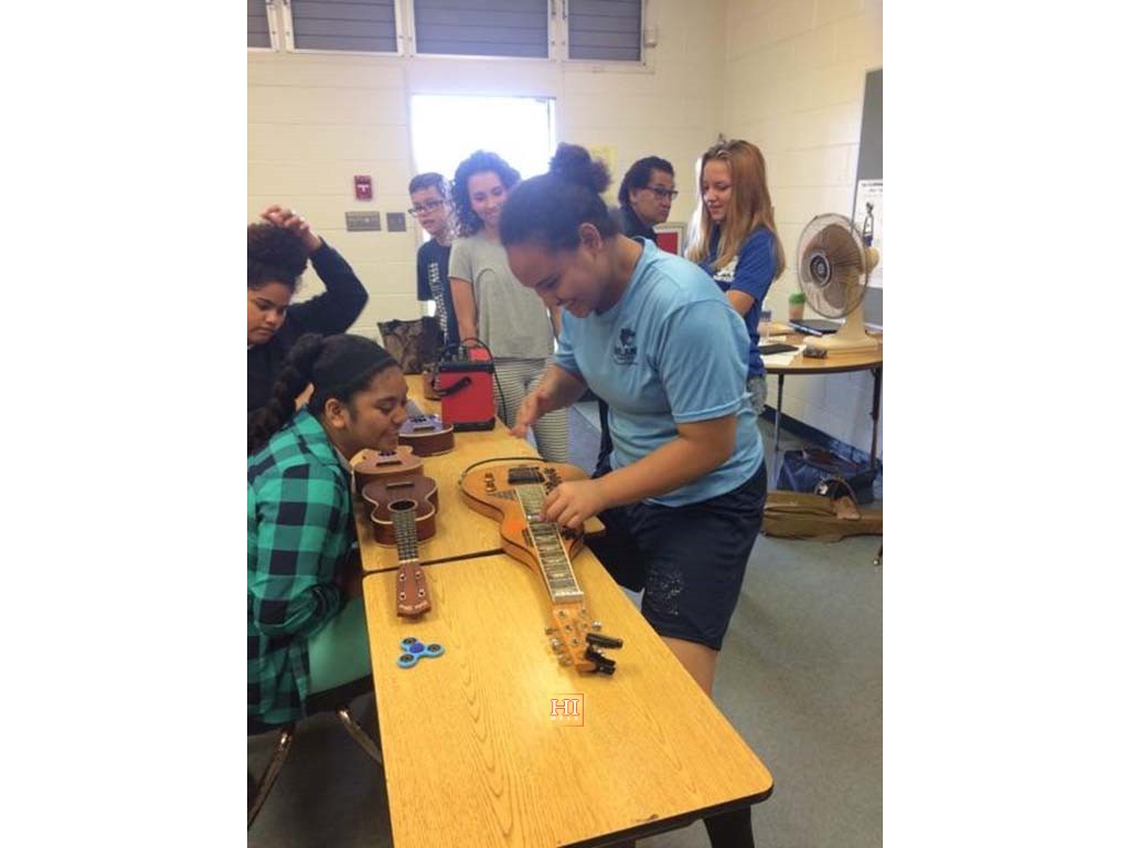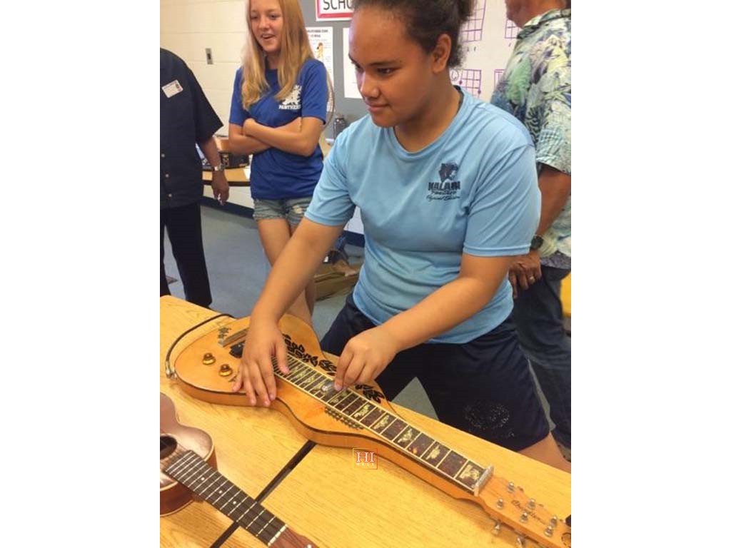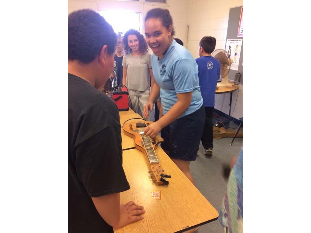 A student trying her hand at playing the steel guitar. Photo by Sandy Sardinha.