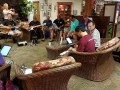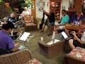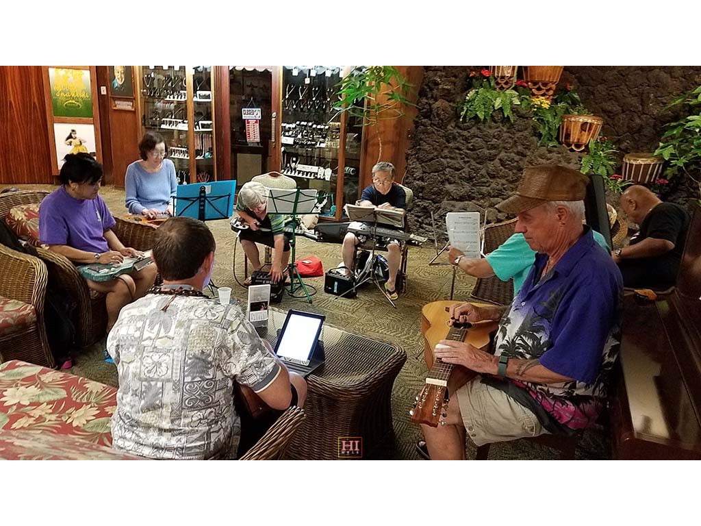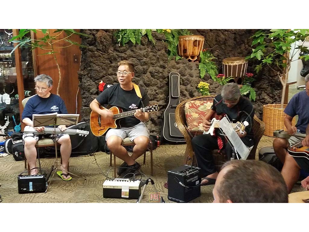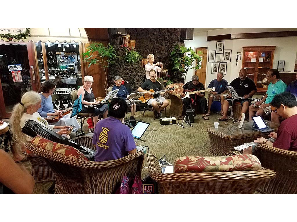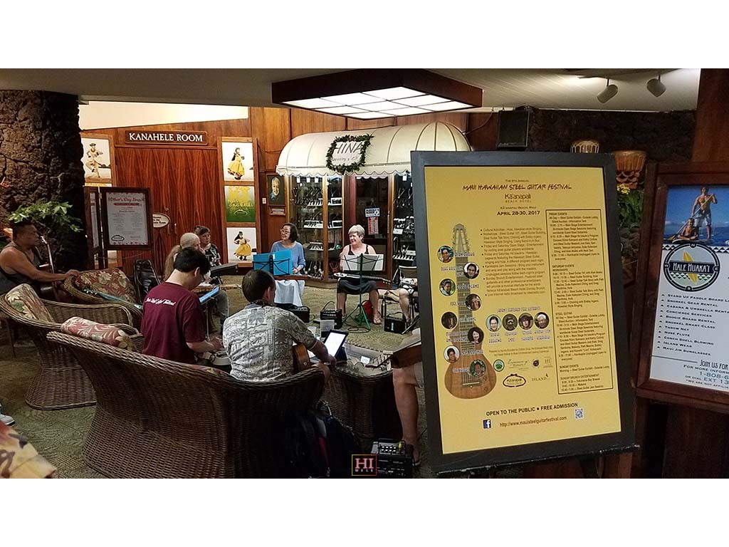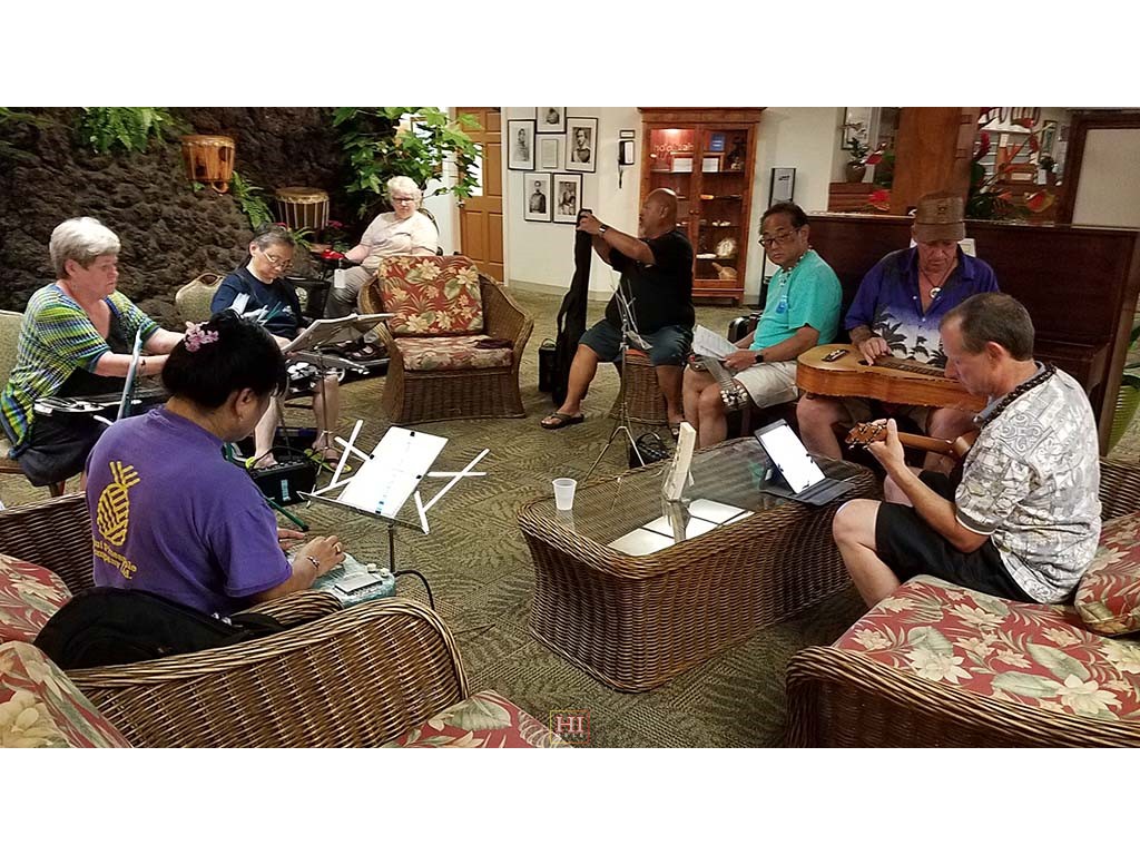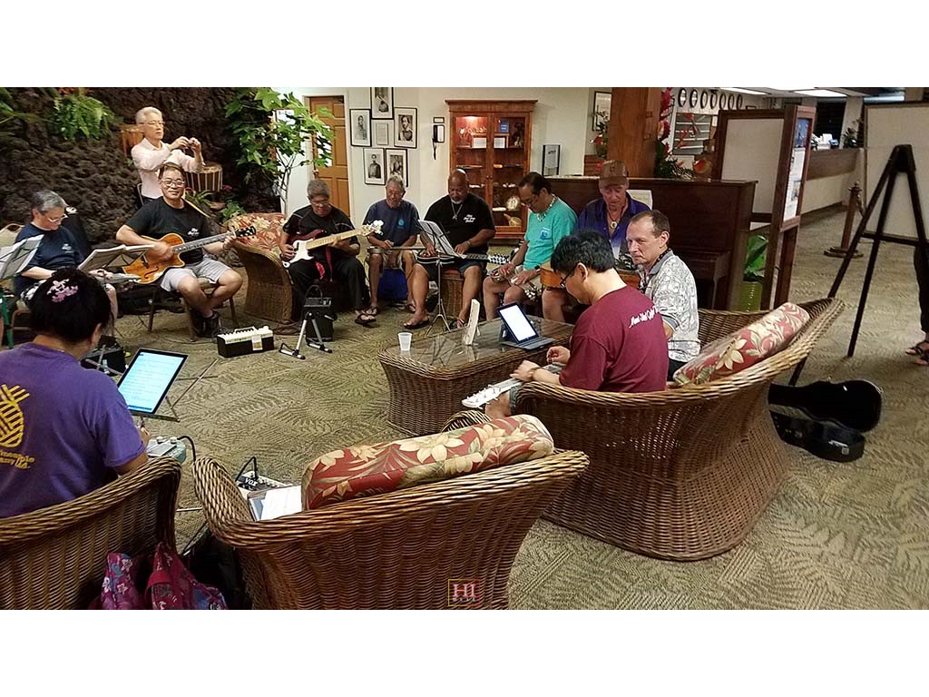 An unplanned hotel lobby pre-festival kanikapila was held on Thursday, April 27, 2017. The kanikapila was led by Alan Akaka and included graduates of the 2017 Hawaiian Steel Guitar Camp plus some festival guests Photos by Addison Ching.