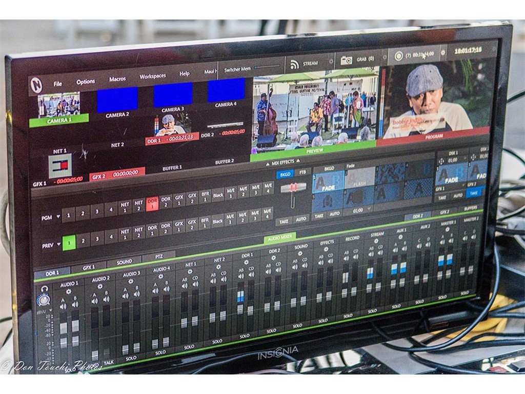 The console allowed insertion of prerecorded files (PROGRAM screen) into the live feed (PREVIEW).