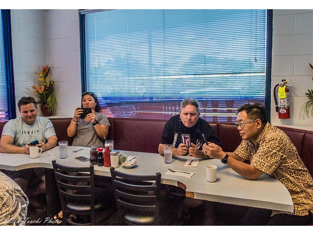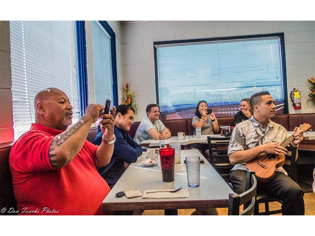 The breakfast group participated in an impromptu kanikapila. From left: Larry and Shirley Holu, John and SooJean Misailidis, Jake Fernandez, and Kapono Lopes.