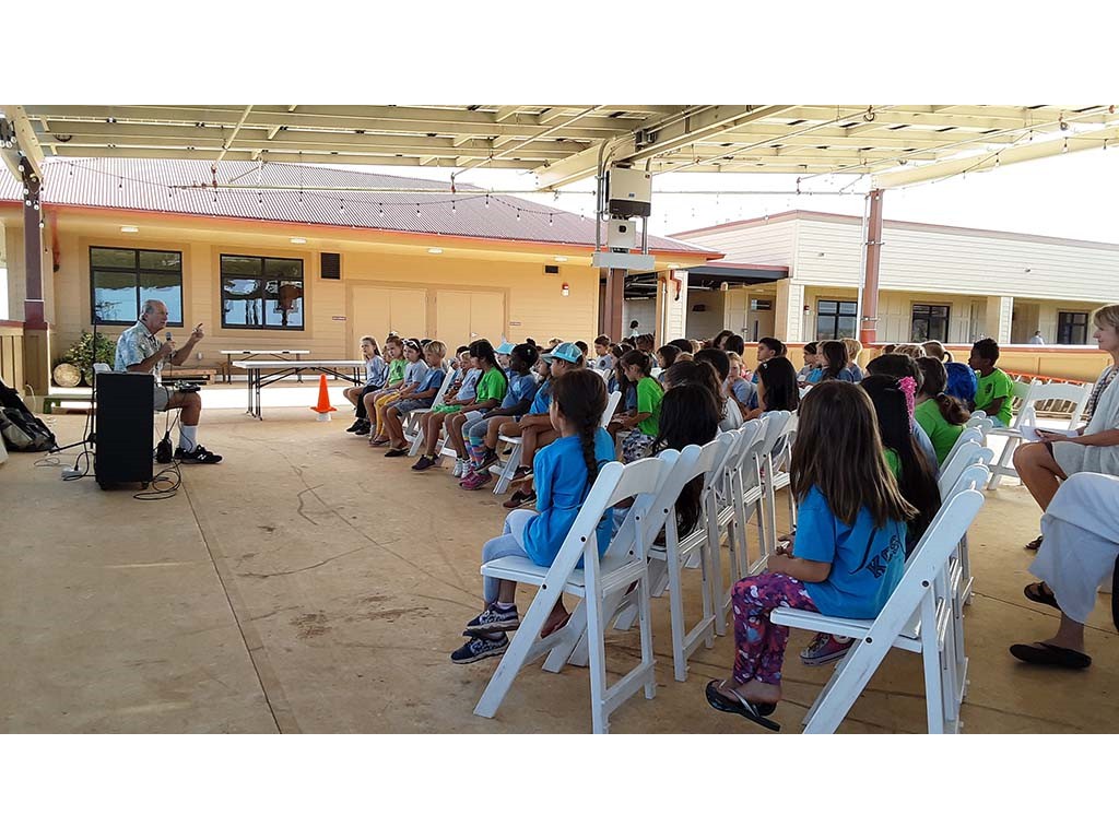Kihei Charter School assembly. Daniel Tremblay talks about the steel guitar.