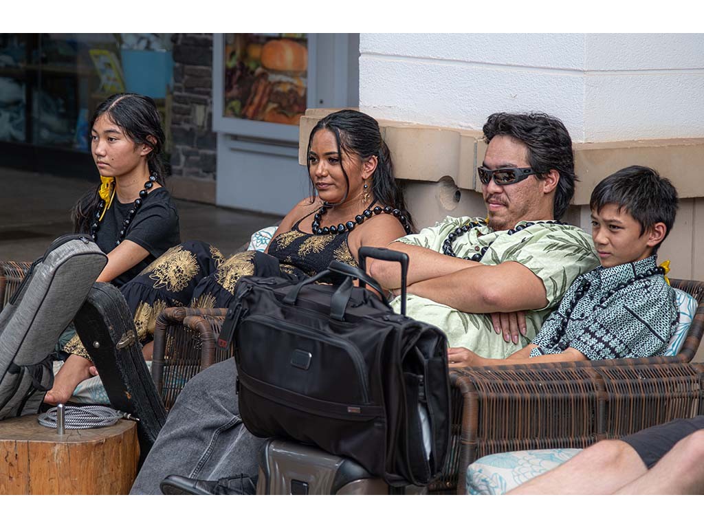Other festival performers await their turn. From left: Hiʻipoi Lindsey, Mālie Lyman, Devin Nakahara, and Isaac Woodward.