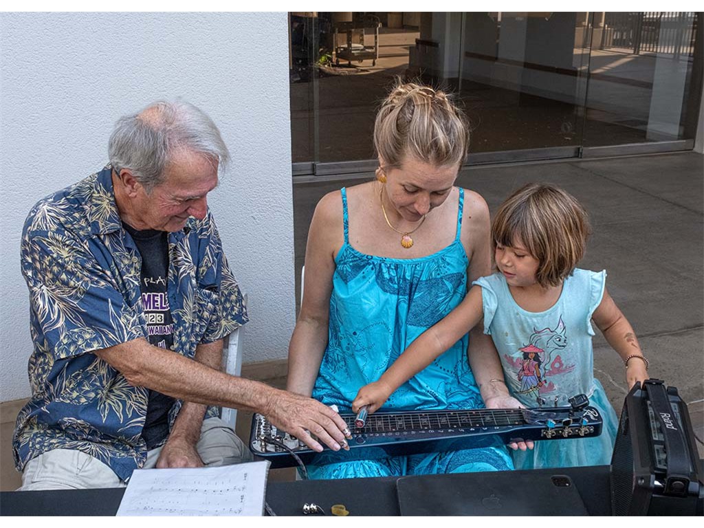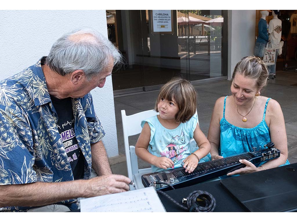 A keiki guest gets the hang of it as Danny and her mom look on.
